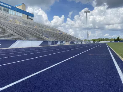 It was renamed Hodges Stadium after a generous gift of $2 million from George and Kernan Hodges that was announced in October 2006. After the installation of seating in the existing stands, a completed press box and field/track lighting during 2007, the final phase of construction was completed in August 2008 with the installation of the 9 lane Olympic quality track with Mondotrack SX surface. The track has full markings for all NCAA and IAAF events, including the ability to run directional events in either direction on either straight. All field event areas are within the stadium, including 4 horizontal jump pits, 8 pole vault locations, and multiple areas for each throwing event. To round out the package, the facility includes a full 400m, 3 lane warm-up track and brand new IAAF certified equipment provided by UCS.