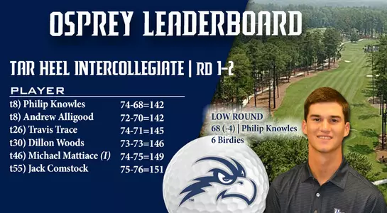 The Ospreys concluded their 36-hole day with a tournament total of 1-under 575, bolstered by an afternoon round of 6-under 282. Sophomores Andrew Alligood and Philip Knowles led the way for UNF by finishing the day tied for eighth in medalist play with matching scores of 142 (-2). Alligood posted the squad's low score in the first round at even-par 72, while Knowles fired the team's best round of the day with a 4-under 68 in the afternoon session.